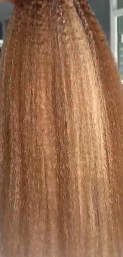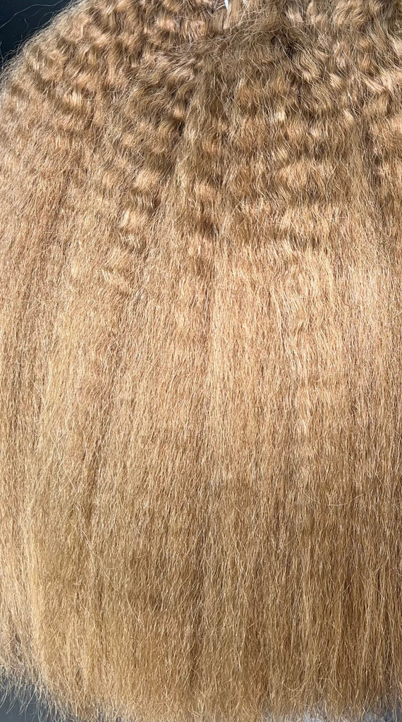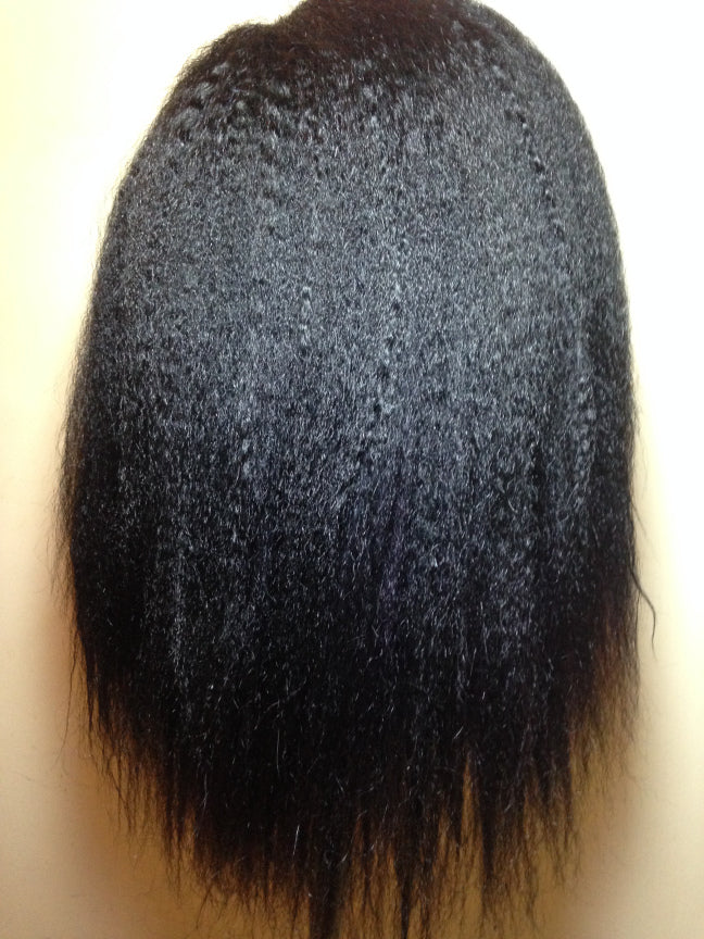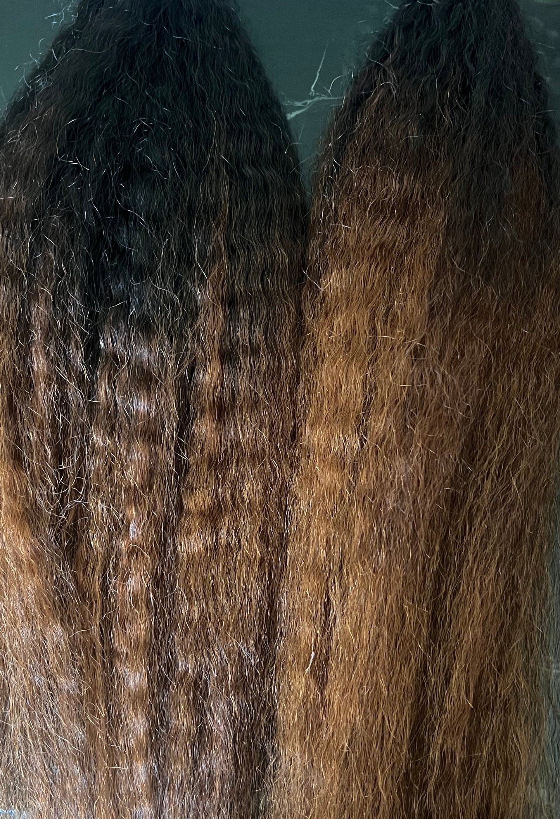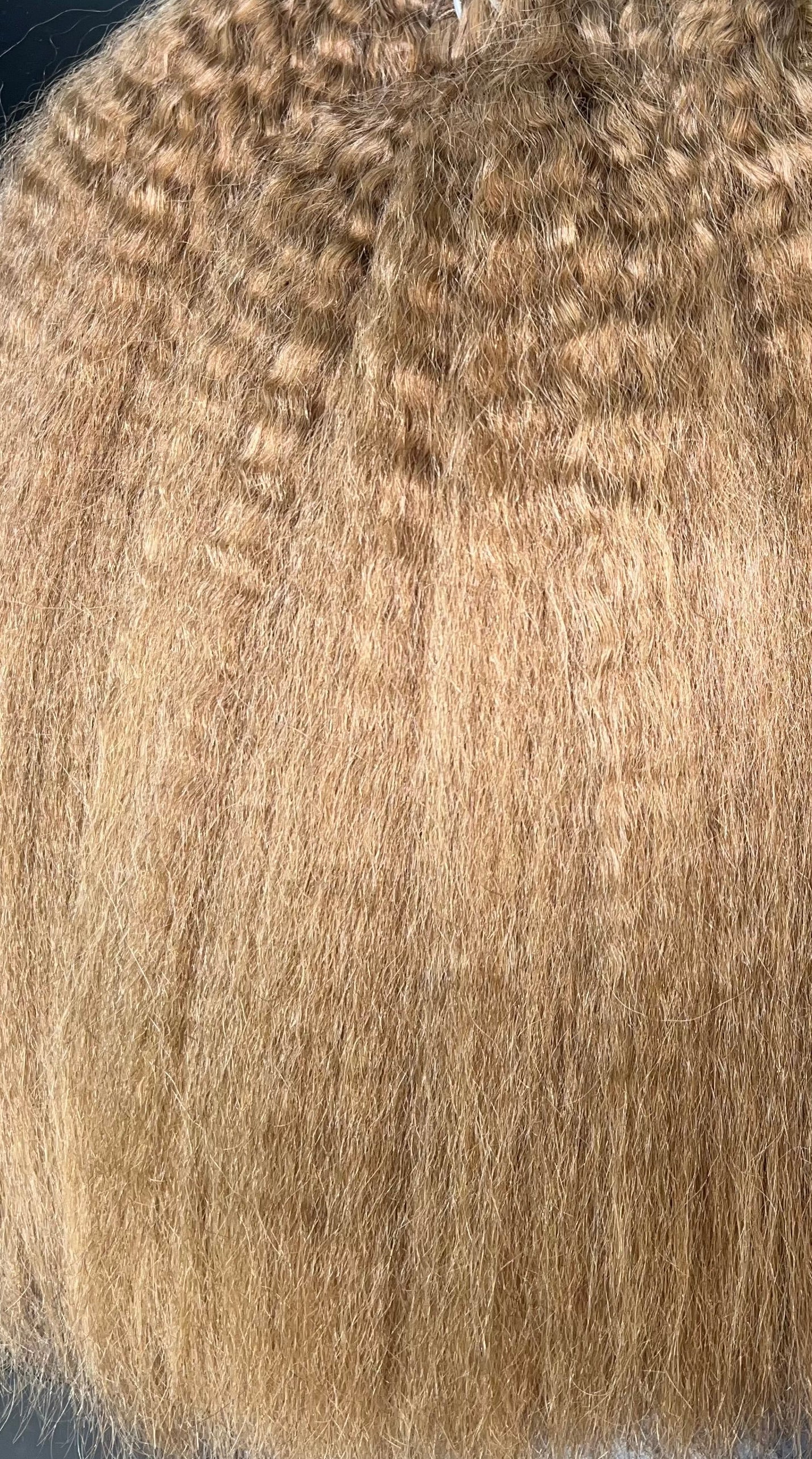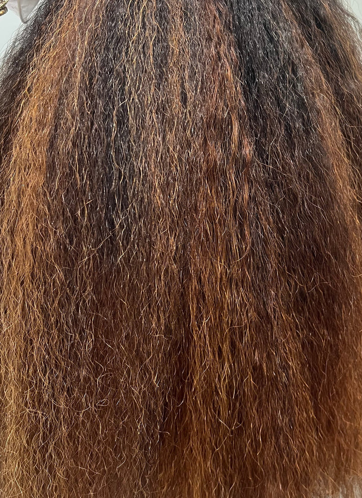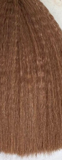 Kinky straight hair mirrors African American hair that has been blow dried straight. This low luster hair is light, very full and fluffy with plenty of movement. It can be worn in its natural state, heat curled or flat ironed for a sleek look. Can be reused for years with proper care.