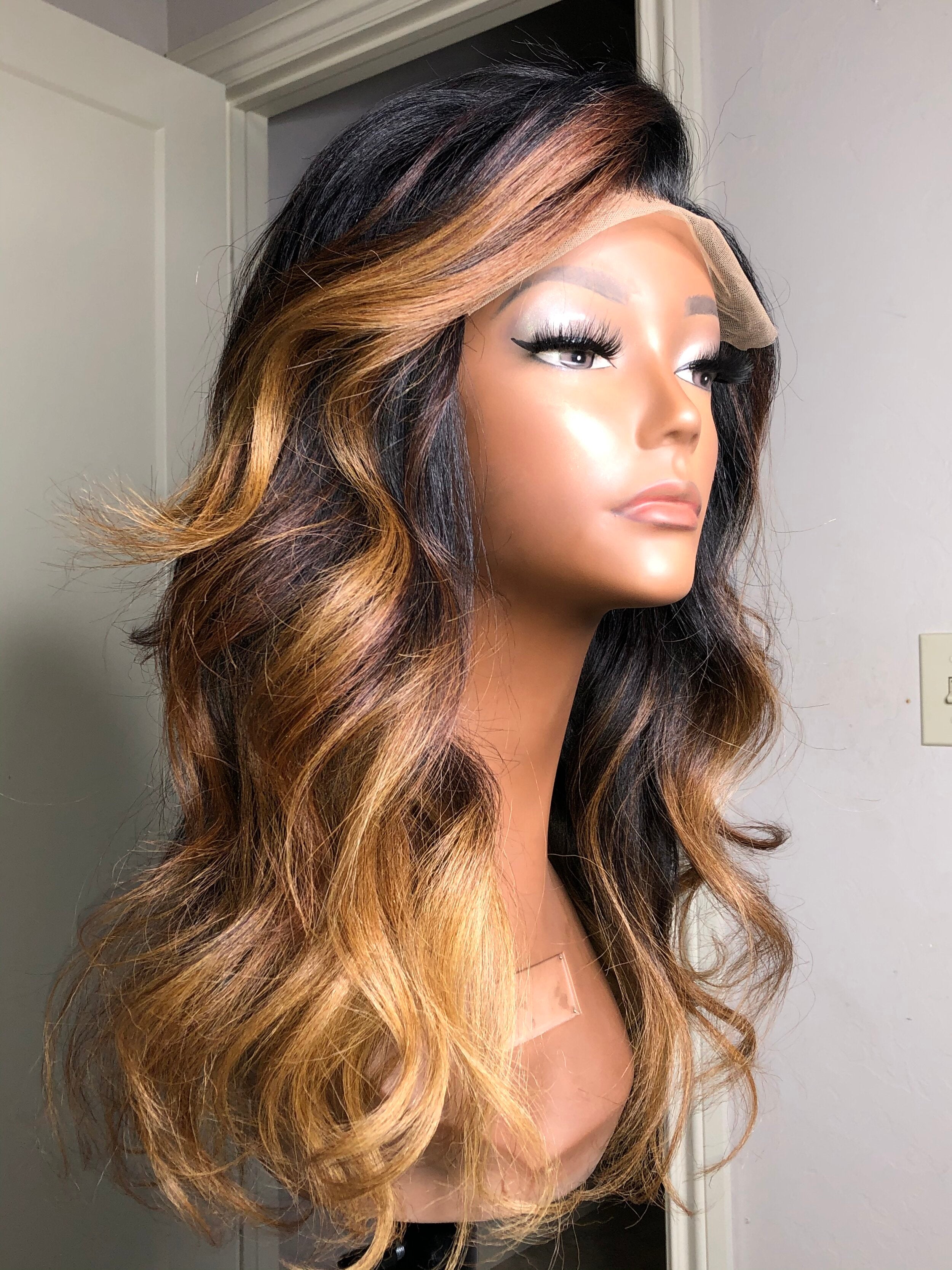 Kinky Straight tresses custom colored a range of blonde and golden dimensional highlights.